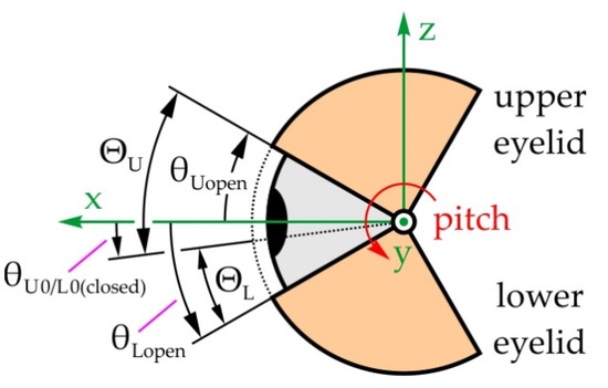 Blinking is a complex, short, and nearly periodic physiological action during which the eyelids fully close and fully open, while the duration depends on the type of motion. According to Refs. [113,114], the principal types of eyelid movements are: (i) reflex blinking—involuntary, abrupt, and rapid movements caused by stimulation of the retina, for example, a touch or any other peripheral stimulus; the duration of this type of blink is the shortest and equals 205 ± 18 ms, (ii) voluntary blinking—movements which the subject does willingly due to internal or external commands; the duration of these movements is longer and equals 275 ± 37 ms, and (iii) spontaneous blinking—unconscious and continuous movements with the longest duration of any type that equals 334 ± 67 ms. It should be noted that the closing phase lasts 2.5 times less than the opening phase, meaning that the speeds differ as well [114]. The spontaneous blink rate is on average 10–20 blinks/min [115], depending on age, gender, time of day, as well as the fatigue and concentration of the subject—women blink twice as much as men in the same time period [116]. According to Ref. [117], the range of motion of the upper eyelid depends on the type and phase of the motion, with the highest value being reached during the closing phase of reflex blinking, 41.3 ± 5.3°, and with the angular speed of the upper eyelid reaching values of 1108.0 ± 157.0°/s. The range of motion of the lower eyelid has only been discussed in the available literature as a consequence of vertical saccades, when the eyelids move together with the eyeball in an up-and-down motion [118]. Visually, when in the normal eyelid position, the upper eyelid is 2 mm bellow the periphery or the iris, while the lower eyelid is exactly on the periphery of the iris [119]. On the other hand, some authors measure the distance between the eyelids and the center of the pupil [120,121]. Observation has shown that the line of contact between the eyelids when the eyes are closed is between the center of the pupil and its periphery, which is when the lower eyelid achieves the maximum possible rotation angle.