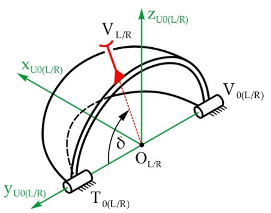 Figure 5 shows the structure of the eyelid mechanical system with a total of 4 DOFs, which enables the rotation of the upper and lower eyelids—angles θU(L/R) and θL(L/R), respectively. The upper/lower eyelids UELL/R and LELL/R are spherical shells with centers in points OL/R (the eyeball center points). The mechanical system consists of four spatial mechanisms with RSSR configurations, driven by actuators placed in joints U0(L/R) and R0(L/R). The unit vectors of the R joint axes are nθU(L/R) and nρL/R for the upper eyelid, and nθL(L/R) and nσL/R for the lower eyelid. The local coordinate systems are fixed to the appropriate eyelid and in the initial position, the directions of the axes coincide with the fixed global coordinate system Oxyz. The eyelids are open in the initial position. When they close, the plane where they make contact lies along the y-axis and is at a 10° angle relative to the horizontal plane. Since the mechanisms of both the left and right eyelid are structurally identical, the indexes denoting left L and right R will be omitted in the following text.