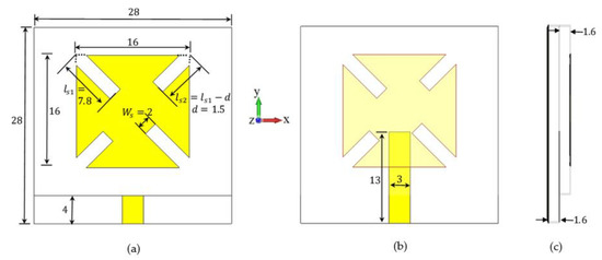 The structure of the proposed antenna is illustrated in Figure 1. The proposed design is a microstrip antenna that is fully covered by the ground plane. Moreover, the antenna consists of a double-layer structure with proximity-coupled feeding structure for broadening the microstrip antenna bandwidth [2]. The top view of the proposed antenna that is shown in Figure 1a consists of two unequal pairs of slits to provide two slightly separated resonant frequencies in order to attain the circular polarization (CP) criterion of the single feed structure [1]. If the length of the longer slit is equal to , then the length of the shorter slit is equal to . The value of the difference in length () is optimized to obtain the suitable separation between the two resonant frequencies that results in a circular polarization. The width of each slit is found to be a vital parameter that can control the bandwidth and the orientation of the CP. Figure 1b shows the structure and the dimensions of the feed line located in the second layer of the antenna. The antenna side view shown in Figure 1c is a composition of two -thick FR4 dielectric material with dielectric constant equal to and loss tangent equal to . The dimensions of the resulting antenna are 28 × 28 mm2.
