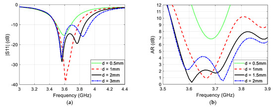 (a) Reflection coefficient and (b) broadside AR of the proposed microstrip antenna at and different values of .
