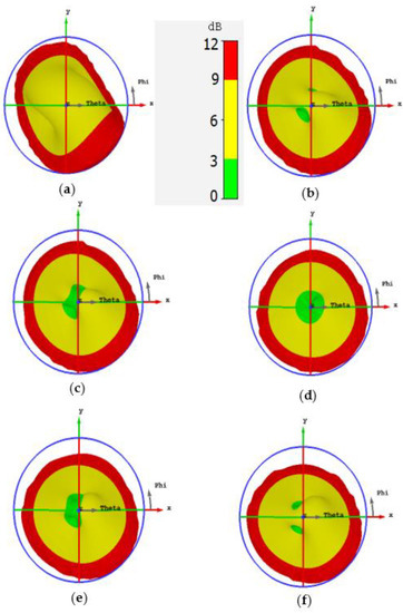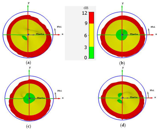 Figure 3 illustrates the 3D AR pattern of the proposed antenna for different values of slit width at 3.6 GHz. It is clear from Figure 3a that the CP is entirely absent in the broadside direction. However, by increasing the slit width to 1 mm, two circularly polarized regions (the green spots) start to appear as shown in Figure 3b. A slit width equal to 1.5 mm brings the two circularly polarized regions close to each other almost within the broadside orientation (see Figure 3c). The overlapping of the two circularly polarized regions in the broadside direction is completed at slit width equal to 2 mm as revealed in Figure 3d. The reason behind this overlapping is that increasing the slit width compels the electrical surface current of the antenna to concentrate in the central part of the antenna patch. As a result, the rotation of the electrical current is restricted in the central part of the patch which results in CP in the broadside direction.