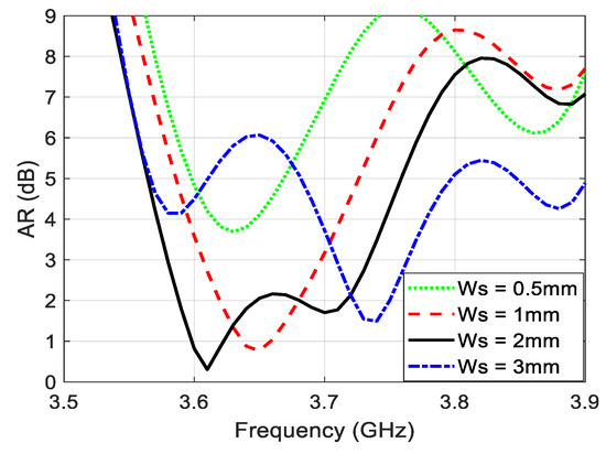 Broadside AR of the proposed microstrip antenna of slits at and different values of .