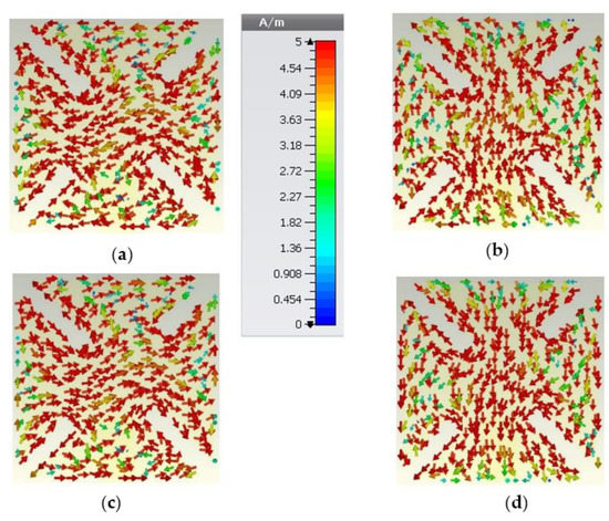 Finally, to verify the presence of the CP within the broadside direction, the current distribution at the antenna patch is demonstrated in Figure 6 for different time instants at 3.6 GHz. The rotation of the current can clearly be seen in the central part of the radiating patch, and this confirms the presence of left-hand circular polarization (LHCP) in the broadside direction. If right-hand circular polarization (RHCP) is required, the positions of the longer and shorter pairs of slits should be swapped.