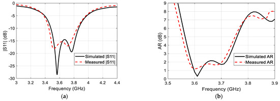 Figure 7 illustrates the prototype of the proposed microstrip antenna. The top and bottom layers were joined using cyanoacrylate adhesive material. The simulated and measured reflection coefficients are demonstrated in Figure 8a, while the simulated and measured AR at the broadside direction of the antenna as a function of frequency is exhibited in Figure 8b. The simulated impedance bandwidth of the proposed antenna is found to be equal to 10.8% along the range (3.48–3.87 GHz), while the measured impedance bandwidth is equal to 10.9% along the range (3.46–3.86 GHz). On the other hand, the simulated ARBW is equal to 4.1% extended along the range (3.58–3.73 GHz), whereas the measured ARBW is found to be equal to 4.12% along the range (3.57–3.72 GHz).