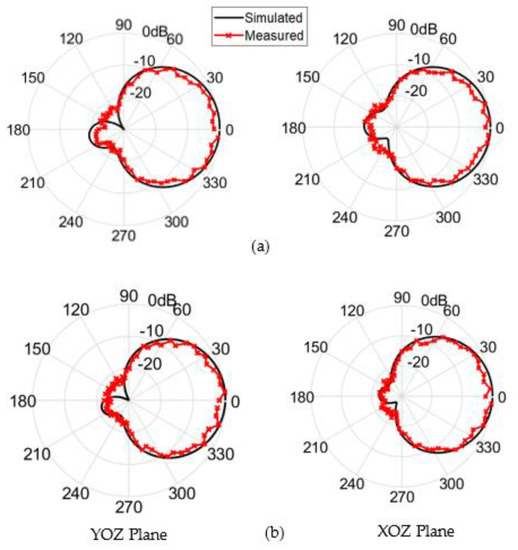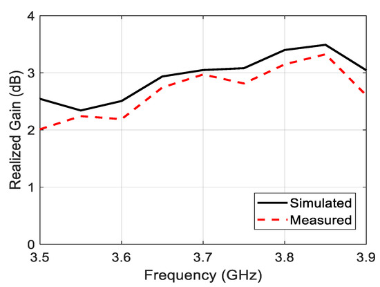 The simulated and the measured normalized power patterns at the YOZ and XOZ planes of the proposed antenna at 3.6 GHz and 3.7 GHz are revealed in Figure 9. By taking a look at these normalized power patterns, one can easily deduce that the antenna has a broadside radiation with a subtle amount of back radiation with main lobe to back lobe level ratio that approaches values larger than 20 dB. Unlike the omnidirectional pattern, the small amount of back radiation is very important in the 5G handsets to protect the consumer’s head from the radiation of these devices. Figure 10 illustrates the simulated and the measured maximum realized gain over the entire operating band of the antenna. This figure shows a very acceptable gain value along the frequency range of interest. The deviation between the simulated and the measured gain is attributed to many factors, such as the reflections coming from the surrounding equipment inside the chamber, the irregular distribution of the dielectric constant with the frequency, and the losses caused by the imperfect soldering and the adhesive material used to stick the two layers of the antenna.
