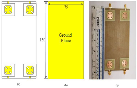 This work exploits the previous single-element antenna structure to design 2 × 2 MIMO structures as shown in Figure 11. Figure 11a,b represent the front and the back views of the proposed MIMO antenna, while Figure 11c shows the prototype of the proposed design. The proposed MIMO structure is etched on FR4 dielectric substrate with the standard cellphone dimensions (). The antenna elements are arranged at the corners of the substrate in such a way that all the antennas give LHCP. It is important to notice that all the dimensions of the single antenna are kept as they are.