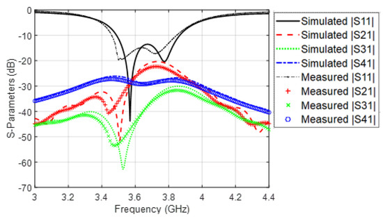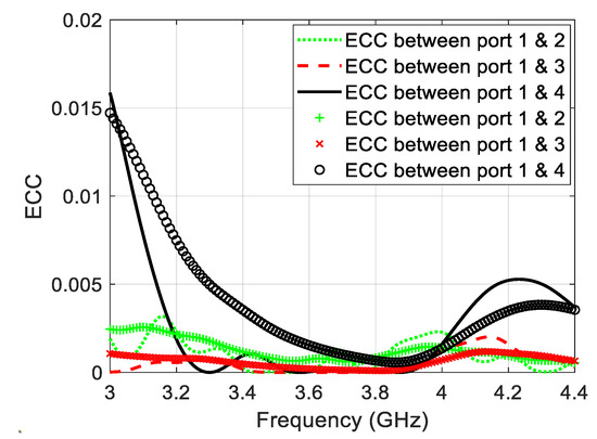 The mutual coupling between the four antennas can be demonstrated with the aid of the transmission coefficients between the antennas. Unlike the non-symmetrical MIMO structure which requires the forward and the backward transmission coefficients [21,22], the symmetrical MIMO structures requires just the forward transmission coefficient in describing the mutual coupling between the antennas. Figure 12 shows the simulated s-parameters of the MIMO antenna, whereas Figure 12 illustrates the measured s-parameters of the proposed MIMO antenna. Since the MIMO antenna have transmission coefficients less than , the isolation between the antennas is almost perfect without the need for adding isolation elements because it is less than the margin of −15 dB [9,23,24]. The Envelop Correlation Coefficient () between every two antenna elements (say 1 and 2) is given by [25]: