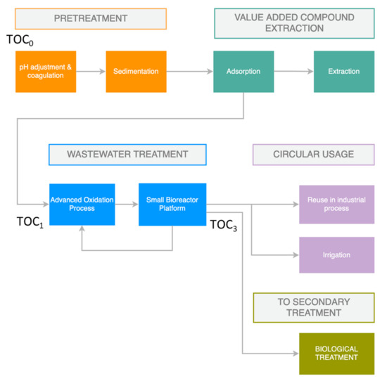Conventional wastewater treatment techniques long-established in the food processing sector mainly include filtration, coagulation [7] and (primary/secondary) biological treatment [8]. They require high investments, skilled personnel and increased maintenance costs, providing slow processes, an extremely low capacity to adapt to wastewater changes and limited efficiency to degrade a high range of organic substances [9]. Such techniques offer an outdated approach to wastewater management, overlooking the potential to recover VACs and recycle/reuse treated water.