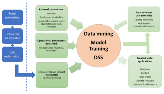 Although data prediction algorithms and DSS systems have been developed in the past, their integration to produce a holistic AI-powered system requiring minimal human intervention has not been thoroughly studied, especially in the sector of food processing. Additionally, the introduction of criteria, regarding the optimum reclamation of VACs, in combination with consequent wastewater treatment, has not been attempted. The information derived from online process monitoring through sensors, treated-water quality prediction modeling and operation simulation of the water reclamation process can be integrated in an IDSS fed by internal and external criteria to produce possible water reuse applications.