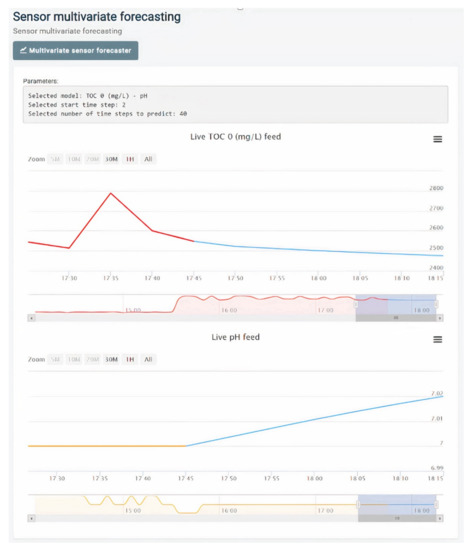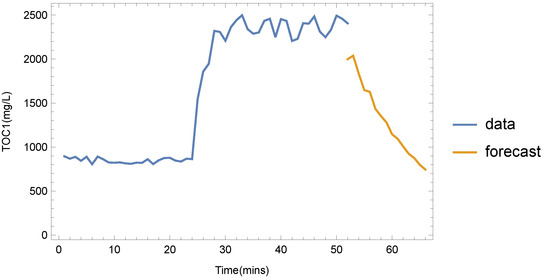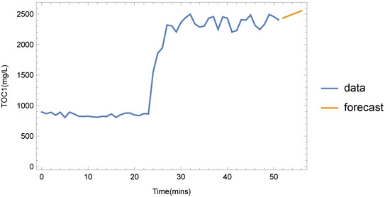 These two cases are depicted in Figure 6 and Figure 7. In this example, there was a sudden increase in TOC0 after approx. 22 min of normal operation. After the 50 min mark, TOC0 was returned to normal levels. For the case of single-variable forecasting, the DSS projected high future values, as recent TOC0 values were not taken into account. The multivariate forecast, on the other hand (Figure 7), shows that TOC1 values are expected to fall. Although the exact values may still be misaligned from the real ones for some time, the event that denotes that TOC1 values have dropped can be easily deduced.