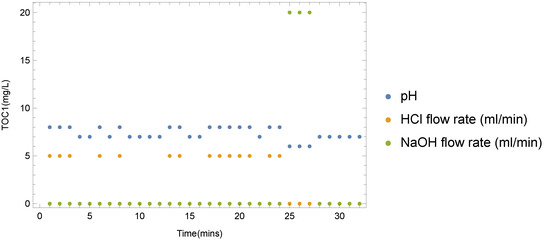 By constant monitoring of operational values, the WTM can react to changes without the need for human intervention. One such example is the automatic injection of HCl or NaOH to compensate for deviation in pH from the neutral value of 7. Figure 8 depicts a typical use case of the automatic responses feature. Each data point represents the observed values of pH, HCl or the NaOH flow rate in a minute interval. It can be seen that the responses of the WTM have a minimal (lower than one minute) latency in injecting HCl or NaOH to adjust the pH value.