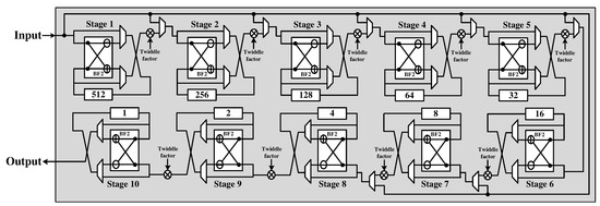 Figure 5 shows the hardware architecture of the R2SDF FFT module, which is known to satisfy the trade-off between the throughput and hardware area for a one-channel FFT. The module can support 8, 16, 32, 64, 128, 256, 512, and 1024-point lengths by selecting the input signal for the operation in each stage.