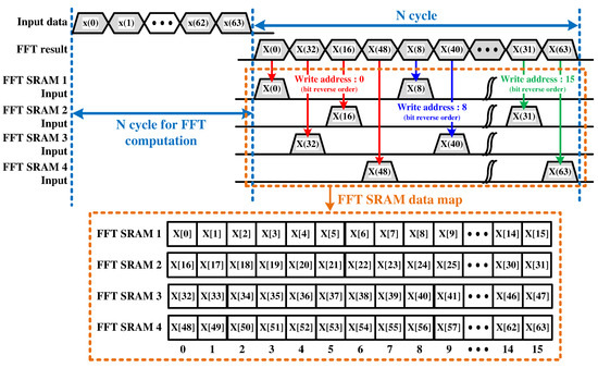 As mentioned, the SDF architecture has the disadvantage of linearly increasing the hardware complexity in proportion to the number of channels. In the case of a four-channel FFT operation, one radix-4 MDC (R4MDC) architecture is implemented with a smaller area than the four R2SDF architectures [35]. However, if the existing MDC architecture is applied, there is a problem that the overall computational latency and the processor area will also increase. This is because of the many delay elements of the first data mapping module (DMM) that align the data from the input stage [36]. The first DMM for the 1024-point FFT has 3072 delay elements, which corresponds to a memory size of approximately 12.3 KB based on 32-bit complex data. To reduce this resource, the proposed CWT processor imitates the data alignment process of the first DMM using four FFT SRAMs to store the FFT results. The proposed processor removes the first DMM by storing the FFT results in four FFT SRAMs and performing the aligning function for MDC IFFT. Figure 6 shows the timing diagram for storing the 64-point FFT results in the four FFT SRAMs and the final memory map of the FFT SRAMs.