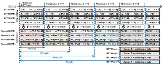 After the FFT result is written to all four SRAMs, four-channel multiplication is performed. For multiplication, the proposed processor has four wavelet SRAMs that can load daughter wavelets in the frequency domain. At most, 24 wavelet signals with 1024 points can be loaded. The output values of the four FFT SRAMs and wavelet SRAM are multiplied and used as the input of the IFFT module. Figure 7 shows the timing diagram of the proposed processor’s four-channel multiplication and IFFT operations. In Figure 7, FFT SRAM is the output of FFT SRAM, and wavelet SRAM denotes the output of wavelet SRAM.