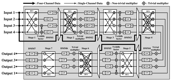 The four-channel IFFT module, in which the first DMM has been removed, is designed using the MRMDC architecture. Compared with the R4MDC architecture, the MRMDC architecture has a smaller area because some non-trivial multipliers can be replaced with trivial multipliers [37]. Unlike the radix-4 algorithm, which supports variable lengths limited to a power of 4, it can support various variable lengths, such as the radix-2 algorithm [38,39]. The IFFT module is designed to support 8, 16, 32, 64, 128, 256, 512, and 1024 points of variable length data by selecting input signals from each stage, such as the R2SDF FFT module within the same processor. Figure 8 shows the MRMDC IFFT module of the proposed CWT processor.