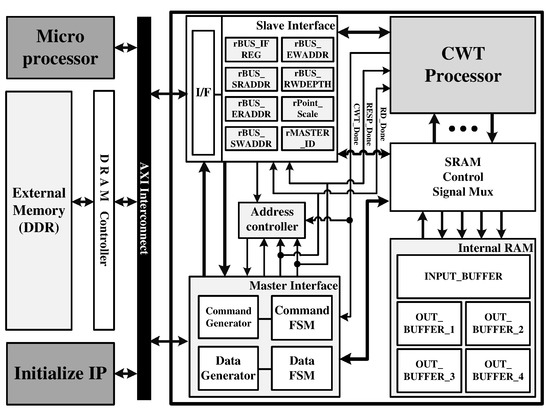 The proposed CWT processor was configured on the FPGA-based verification platform using the advanced extensible interface (AXI) bus interface, as shown in Figure 9. The verification platform consists of the proposed CWT processor, external double data rate (DDR) memory, AXI master interface for data load and store in DDR, and AXI slave interface for interaction between the micro-processor (MP) and the CWT processor by setting the predefined registers. First, input data and wavelet data for the verification of the CWT processor are loaded in external DDR memory. In addition, several parameters such as the FFT-point length and the number of wavelets are set by MP through an AXI slave interface. When MP initiates the CWT operation, the proposed CWT processor reads the wavelet data and input data and stores them in four wavelet SRAMs and input buffer, respectively. After the CWT operation is completed, the results are stored in external DDR memory through an AXI master interface. Figure 10 shows the verification environment using the FPGA platform.