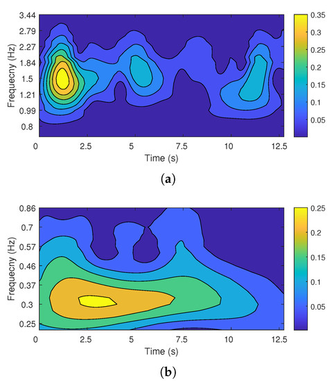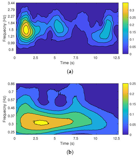 The CWT scalogram from MATLAB: (a) heartbeat; (b) respiration.