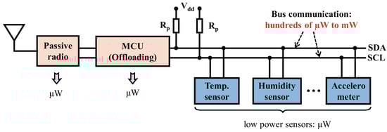Nevertheless, improving the power efficiency of such processor-free sensing devices is still challenging, because bus communication can take significant power for exchanging data between each component. The bus communication represents a data transmission process executed on the digital bus (e.g., the IC bus and the SPI bus) of the sensing devices. In traditional embedded systems, it is reasonable to suppose that bus communication consumes insignificant power since radios and processors account for the majority of power consumption, which drains at the level of milliwatts (mW). However, we observe that the power consumption of bus communication is increasingly becoming a predictable bottleneck for such processor-free sensing devices. For example, the advanced backscatter radio designs show power consumptions of about W [7,8], whereas an IC bus can eat power of W when operates at the standard mode (Section 2.1 in detail), of the power consumption of backscatter radios, as shown in Figure 1. Similarly, SMbus also consumes hundreds of s of power, as it requires similar pull-up resistors and supply voltages as IC [9,10]. The power-consuming bus communication between the major components makes it challenging to further optimize the power consumption of processor-free sensing devices. In addition, the high power consumption of bus communication also constraints the number of sensors equipped on IoT end devices.