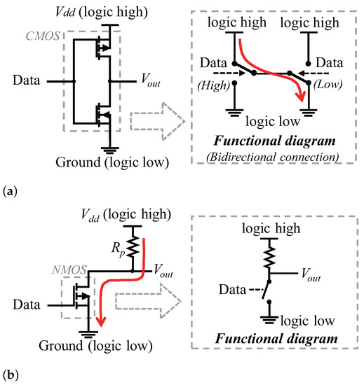 The push–pull architecture leverages a typical CMOS configuration, as is shown in Figure 2a. Each CMOS acts as a single-pole double-throw (SPDT) switch, which is driven by the transmitting data. When the logic level of data is high, the NMOS is turned on and connects the to (logic high). When the logic level of data is low, the PMOS is turned on, and then the is connected to ground and becomes logic low. However, two push–pull outputs cannot be connected together, since the current will flow freely from to ground if one output is high and the other is low. Thus, the push–pull architecture cannot achieve bidirectional communication.