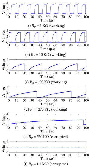 SCL waveform (before the waveshaper) over different pull-up resistances. IC communication works in case of (a–d), while the communication is corrupted in case (e,f).