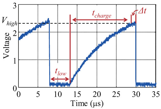 We observe that the communication data rate decreases as the duration to transmit each bit increases. For example, the bit rate is 100 Kbit/s, 84.7 Kbit/s, 43.7 Kbit/s and 22.4 Kbit/s, respectively, in Figure 7a–d. This happens because the PCB has equivalent capacitance , and a higher increases the RC value of bus lines and thus the voltage rises slowly. When the output is above the logic high threshold and this clock period is passed, the output will be tripped to the logic low voltage after hitting . Thus, the time to transmit one bit is formulated as Equation (2).