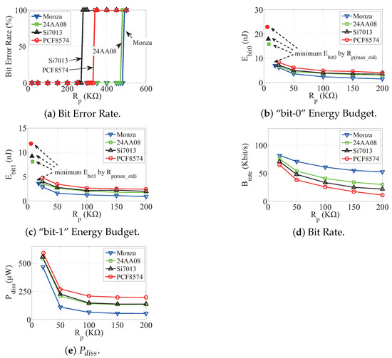 In the experiment, each IC is the slave role in the communication and is controlled by the master processor MSP430F2132 [18] working at 3.3 V supply voltage. The processor sends predefined data to each IC over hundred thousand times. The IC then executes established certain operations according to the data. For example, Monza will respond a fixed register value to the processor. Thus, the processor can evaluate the BER in communication. We repeat this process over different . The results are shown in Figure 11a.