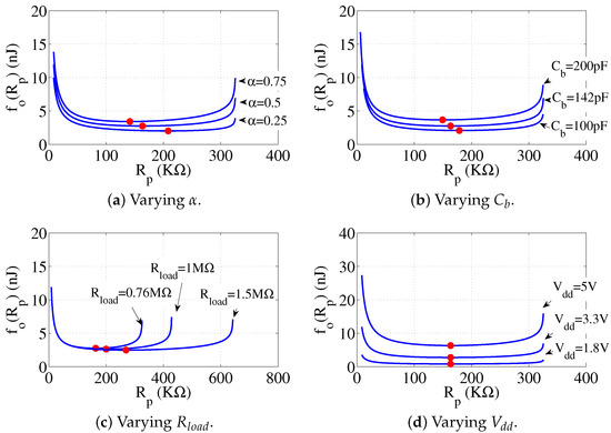 We evaluate and by experiments. We measure and by an oscilloscope and calculate the energy budget according to Equations (4) and (5), respectively. We repeat the experiment at a range of values. The results are shown in Figure 11b,c, respectively. From the results, we observe that and both decrease along with the increase of because the leakage current is reduced. Further, larger incurs higher and when keeps constant. The reason stems from the fact that larger implies more switching dissipation. Furthermore, is higher than in the same condition of and . This is because the leakage current is typically higher than the switching dissipation.