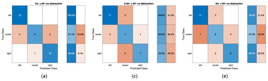 Table 3 shows the means and standard deviations of measured time delays for individual angles of the receiver device. In an absolute sense, the means of the time delay relatively follow the ideal values except for the 60 and −90 cases. The inversion situation is observed between −60 and −90 mean time delay and the saturation condition occurs occurred between 60 and 90 mean time delay. The standard deviations are increasing toward the end directions in an asymmetric manner. Note that the ideal time delays are in a symmetric fashion but the mean time delays are distributed in a non-symmetric profile as well. The statistics for 90 present high variations because of the low sensitivity to the sounds arriving at perpendicular directions. The digital microphone (IMP34DT05TR, STMicroelectronics, Geneva, Switzerland) used in the receiver device does not provide the polar pattern specification; however, conventional microphones with a single accept device depict the supercardioid or cardioid polar pattern which delivers the low signal gain from the side address situations. Figure 23 demonstrates the actual magnitude distributions at a 1 m distance with different angles. The magnitude in Figure 23a as 60 arrival presents a higher signal-to-noise ratio (SNR) than the magnitude in Figure 23b as 90 arrival.