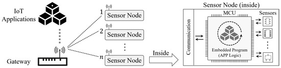 A general operating architecture of IoT sensor nodes, where each node works as an autonomous subsystem that functioned by an on-board MCU running embedded programs, i.e., read sensors and upload the collected sensory data. The gateway works as a data relay that collects the uploaded sensory data from distributed nodes and provides them for corresponding IoT applications.