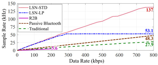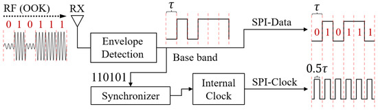 In the data line, data ‘1’ and data ‘0’ are represented by logic high and logic low, respectively. In addition, the synchronous clock is designed for the sensor to receive the data correctly, where each bit of the data are recognized at the rising edge (mode 0) or falling edge (mode 1) of the clock [34]. To generate SPI signals efficiently, we designed a circuit to decode the received RF signal, where each of wireless signal transmission can generate one bit of bus data (considering that the shortest duration of logic high and logic low in the baseband signal is . In the corresponding, the maximum signal changing frequency that the LSN needs to handle is ).