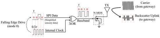 In the uplink phase, we employ the backscatter communication [28] to convey the uploaded bus data to the gateway with ultra-low-power consumption. As illustrated in Figure 4, we utilize SPI mode 0 to output the de-redundant (as described Section 5) sensory data for uplink, i.e., the output of each bit of data is driven by the falling edge of the clock. To prevent the backscattered uplink signal from being swamped by the gateway carrier with much higher amplitude and power, we mix the bus data signal with the clock signal to increase the baseband frequency so that the backscattered signal can be shifted away from the carrier in frequency. The baseband signal changes the antenna impedance by controlling the on/off of a N-type MOSFET (N-MOS) switch, thus modulating the signal on the carrier provided by the gateway. Considering that the carrier frequency is , the clock frequency is , and the signal change frequency on the data line is , the uplink backscatter frequency can be expressed as: