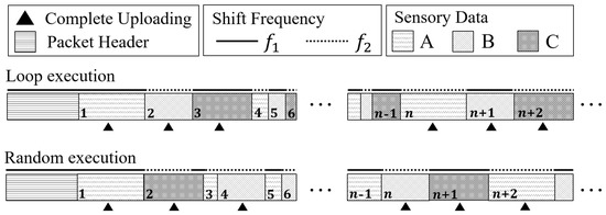 Considering the simplified sensory data have random lengths, we utilize two different frequencies to transmit the adjacent sensory data. By this, the gateway can split the data from each sensor and recover the complete data for the corresponding IoT applications. In addition, with information on data transmission rates and sensor sampling rate of the target LSN, the gateway can precisely calculate the accurate time mark for each sensory data, thus recovering the completed trend of the corresponding monitored physical quantities. To enhance the robustness of the system, LSN performs a complete transmission for all sampled sensors in every n packet to avoid possible cumulative errors caused by communication bit errors. Finally, the length of the package can be set by the real-time requirements of IoT applications. In exceptional cases, each piece of sensory data can be uploaded separately to achieve high real-time sensing.