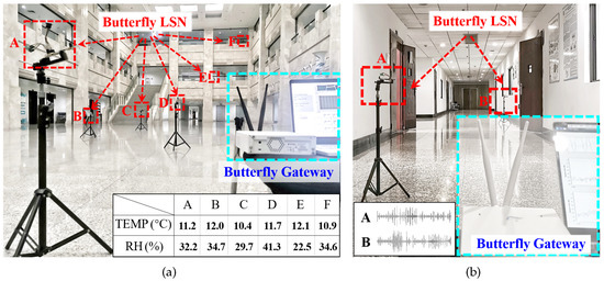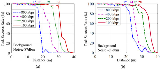 The results demonstrate that, at 800 kbps data rates, an LSN can be deployed at 17 m and 19 m to the gateway in the lobby and corridor scenarios, respectively, where almost all (≥95%) tasks can be successfully performed. In addition, the coverage of the gateway can be further improved by reducing the data rate appropriately. For 400 kbps, the communication distance from the gateway to the LSN can reach 17 m and 24 m in the lobby and corridor scenarios, respectively. For 100 kbps, the coverage distance can be increased to 30 m and 28 m in these two scenarios, respectively. Since the corridor has lower background noise, and the multi-path can enhance the transmitted signal, a Butterfly system can achieve greater coverage in the corridor than that in the lobby.