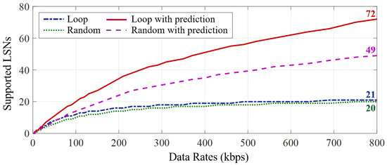 In a Butterfly network, the edge gateway issues downlink commands to manage tasks on multiple LSNs and predict when these LSNs may upload data, thus calculating future bandwidth availability for the issue of the next command, thereby improving bandwidth utilization and extending the network capacity of the gateway to support more LSNs, as shown in Figure 9. For a better understanding, we consider discussing the task perdition of LSNs separately in loop scheduling mode and random scheduling mode, as follows: