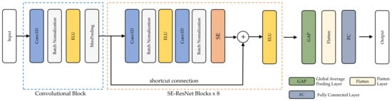 The input sensors were processed using convolutional blocks and SE-ResNet blocks. An ELU layer, a convolutional layer, a batch normalization layer, and a max-pooling layer were all included in the convolution component. Each of the trainable convolutional kernels in the convolutional layer creates a feature map, which is then used in the convolutional layer. One-dimensional kernels are just like the input spectrum. Because of this, BN was used to stabilize and speed up the learning process. The model’s expression capability was improved with the help of ELU, a nonlinear function. Preserving key characteristics was achieved by using the MP layer to minimize map size. The following section goes into further detail about the SE-ResNet module. Flattened layers were utilized to turn the averages of each feature map into a 1D vector using the GAP. Using a Softmax function, the result of the fully linked layer was transformed into probabilistic reasoning. The cross entropy loss function, which is often used in classification applications, was applied to compute the network’s losses.