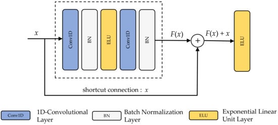 As the network layers increased, a degradation incident occurred: Accuracy rapidly reached saturation and ultimately declined [82]. Adding a bypass link to ResNet’s residual block could successfully solve the degradation issue [24]. Figure 3 depicts the architecture of a residual block. Convolutional layers, BN, ELU, and a bypass connection are all part of this algorithm. There are no differences between the residual block and the convolutional block except for the bypass link. A residual function F(x): = H(x) − x is defined as the sum of the foundation mappings and placed on top of each other. Since the initial mapping was transformed into , the initial mapping is no longer relevant. The residual learning is simpler to implement and avoids the degradation issue than simply fitting using stacked layers.