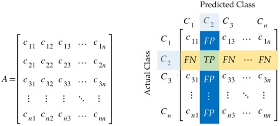 Let consider a multiclass classification problem with set A containing the n different class labels denoted by . The confusion matrix for that problem is an matrix presented in Figure 5. Each row of the matrix represents the instances of an actual class, while each column represents the instances of a predicted class. An element of the confusion matrix at row i and column j provides the number of instances for which the actual class is i and the predicted class is j.