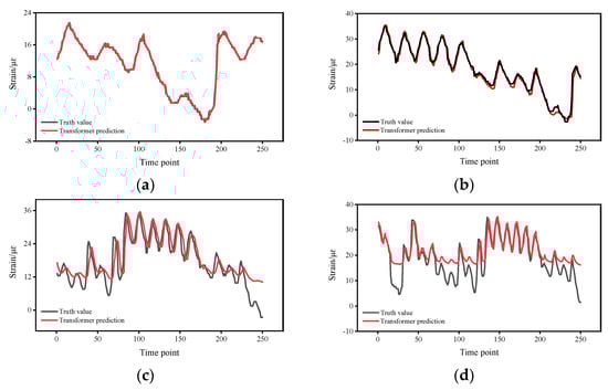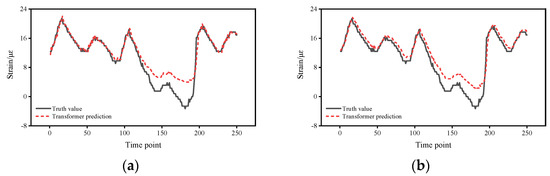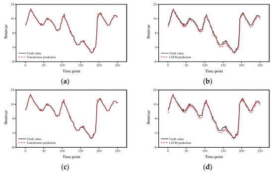 In this paper, two deep learning methods were used for strain response prediction; the first one is the proposed Transformer-based method and the second one is the LSTM-based method. The dataset was used as the bridge strain response dataset in Section 3.1. Both methods used the same training parameters, with the strain response of the previous two hours as the input and the strain response of the next half hour as the prediction target, and the epochs were set to 100. The ratio of training set, validation set, and test set was 0.7:0.1:0.2.