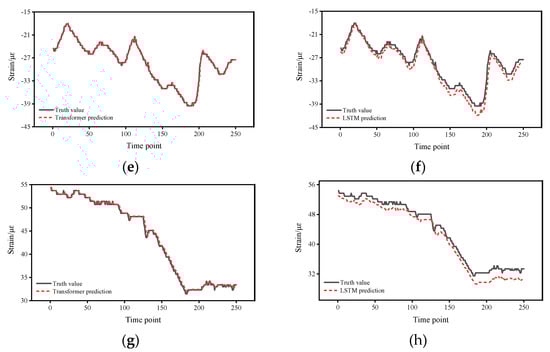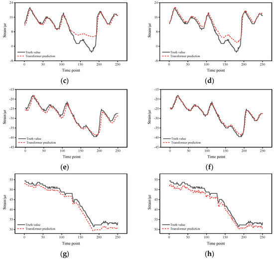 Strain response prediction results of the two methods: (a) Transformer prediction for S01. (b) LSTM prediction for S01. (c) Transformer prediction for S02. (d) LSTM prediction for S02. (e) Transformer prediction for S03. (f) LSTM prediction for S03. (g) Transformer prediction for S09. (h) LSTM prediction for S09.