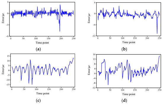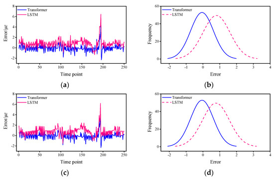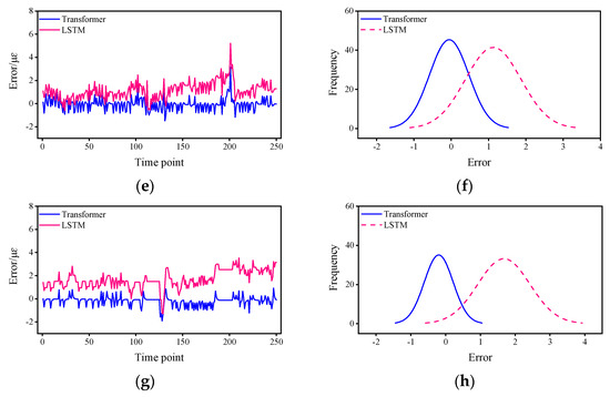 Figure 4 shows the strain response prediction results of the two methods. From the prediction results of the Transformer, the strain response was successfully predicted and the predicted strain response values basically matched with the field test values, indicating that the proposed method is able to predict the strain response in the short term. From the comparison results, the agreement of the proposed method is better than that of the LSTM, which, in general, predicts the strain response trend of the structure, but from the details, there is still a significant difference between the predicted strain response and the test value at some time points, indicating that the stability of the LSTM prediction is not as good as that of the proposed method. To better show the details of the errors, the variation of the errors with time points and the probability density function are calculated so that the variation of the errors with time points and the distribution of the errors can be more accurately reflected.