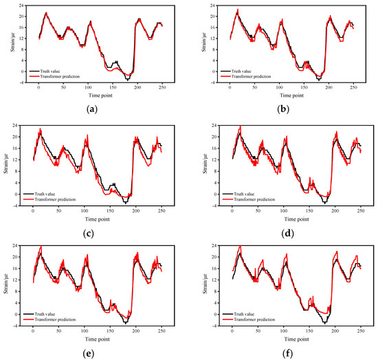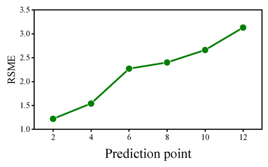 To test the performance of the proposed method in predicting different numbers of strain responses, we changed the parameters of the sliding window and adjusted the number of prediction points to two, four, six, eight, ten, and twelve, respectively, and the results are shown in Figure 6. In particular, when the number of prediction points is greater than one, multiple batches of prediction values are generated for each time point, and the mean value of multiple prediction values is used as the final prediction value in this paper. The RSME for each of the six cases are calculated, and it indicates the magnitude of the prediction error, and the larger the RSME, the larger the prediction error.