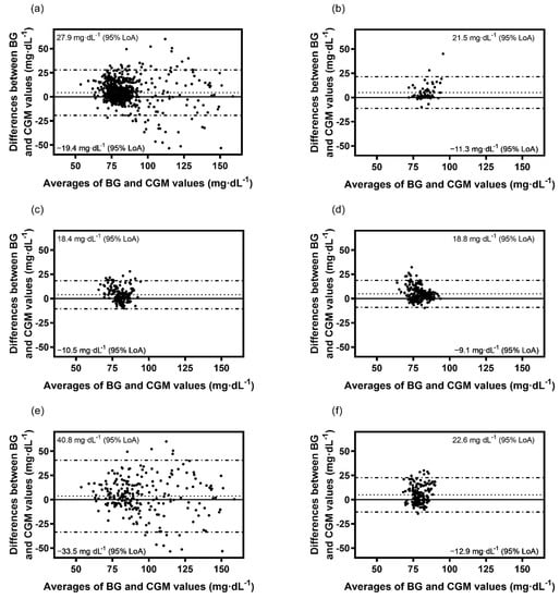 The Bland-Altman method derived bias ± SD of bias and levels of agreement for absolute values of glucose for overall, sodium chloride, 5% glucose, Ringer’s solution and the control condition (rtCGM to BG) were found to be 4.3 ± 12.1 (−19.6, 27.9) mg·dL−1, 4.8 ± 7.1 (−9.1, 18.8) mg·dL−1, 3.6 ± 18.9 (−33.5, 40.8) mg·dL−1, 4.9 ± 9.1 (−12.9, 22.6) mg·dL−1 and 3.9 ± 7.4 (−10.5, 18.4) mg·dL−1, respectively (Figure 1a–f).