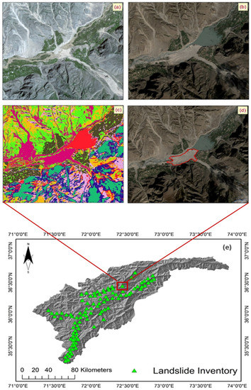 Consequently, the first step is to create a highly accurate landslide inventory map [41,42,43]. The landslide inventory map for this work was created using the landslide data from satellite images (LANDSAT-8) and historical records from official data from the national departments. The data highlighted 506 landslide positions (centroid) in the area. There are three different types of mass movements in the study region, namely rock fall, landslide, and debris flow. This study has processed these different types of mass movements as a single type of landslide event. The landslide inventory map of the study area is shown in Figure 1e. Automatically generating a cartographic inventory of landslides through a change detection technique is further explained.