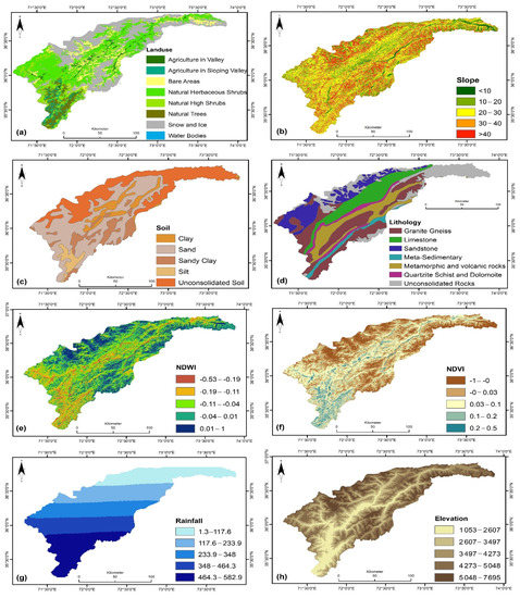 The rainfall map presented in Figure 3g displays the scattering of rainfall between the observed maximum and minimum rainfall over the area, 1.3 mm to 582.9 mm annually. The rainfall in the area decreases gradually from south to north, as shown on the map. The high-elevation regions receive less rainfall as they generally receive snowfall. Generally, high rainfall is more likely to trigger landslides than low rainfall.
