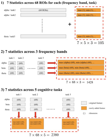 As shown in Figure 2, we computed seven statistical measures (max(·), min(·), max(·)-min(·), mean(·), std(·), quantile0.75(·), and quantile0.25(·)) across three categories: 68 ROIs, 3 frequency bands (θ, α, β), and 5 cognitive tasks. Namely, we obtained 7 above-mentioned statistical measures × 5 tasks × 3 frequency bands = 105 new features by computing these seven measures across mean of all ROIs. Similarly, we generated 7 measures × 68 ROIs × specific for 3 frequency bands and mean across all tasks = 1428 and 7 measures × 68 ROIs × 5 tasks and generalized across-frequency bands = 2380 features by the measures across frequency band and task, respectively. Consequently, the number of features was enhanced to base features (viz. 68 * 3 frequency bands * 5 tasks = 1020) + 105 + 1428 + 2380 = 4933.
