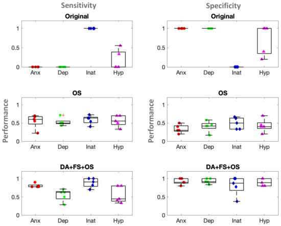 We found that logistic regression performance was best when we used oversampling (OS), data augmentation (DA), and feature selection (FS) of the top contributing features (40,000) from our augmented data, to predict mental health symptoms (Figure 4). We found >80% sensitivity and specificity, particularly for anxiety and inattention, when we employed data augmentation, feature selection, and oversampling techniques to the data. When assuming that the expected proportions by chance are 50% for each class label, the 95th percentile confidence intervals based on the standard error of the proportion are 50 ± 9.95%. For more robust control, we performed 100 iterations of random shuffling of class labels and thereby their association with the samples and performed a stratified cross-validation procedure (see Section 2.10) to find the 95th percentile randomized control accuracy distributions for anxiety, depression, inattention, and hyperactivity; these were 0.60, 0.63, 0.59, and 0.59, respectively. The actual mean ± std accuracies for the DA + FS + OS models were found to be above these random control thresholds, and they were 0.86 ± 0.05, 0.78 ± 0.06, 0.85 ± 0.10, and 0.73 ± 0.09, respectively suggesting the statistical significance of our results. In particular, we show sensitivity and specificity results in Figure 4.