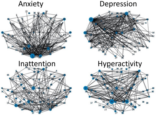 Topographical plot showing “strength” of ROI connections of relevance to mental health disorders, anxiety (upper left), depression (upper right), inattention (bottom left), and hyperactivity (bottom right). Size of each vertex corresponds to sum of chi-square statistic of the vertex. An edge is created when the sum of chi-square statistic of the two vertices that share the edge exceeds threshold: 100. The thickness of all edges is the same.