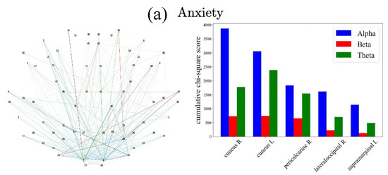 As the “strength” of the given pair consists of various kinds of combinations, it is also worth analyzing which factor (frequency band, task, etc.) most contributes to the “strength”. Thus, for each pair of vertices (ROIs) and each mental health symptom, the highly contributing feature (belonging to the frequency band and cognitive task) was computed. Namely, the most representative factor of pair (i1, i2) was computed as below by finding the max along one feature type and averaging across the other feature types. To compute the max ROI we average the task and frequency band feature types.