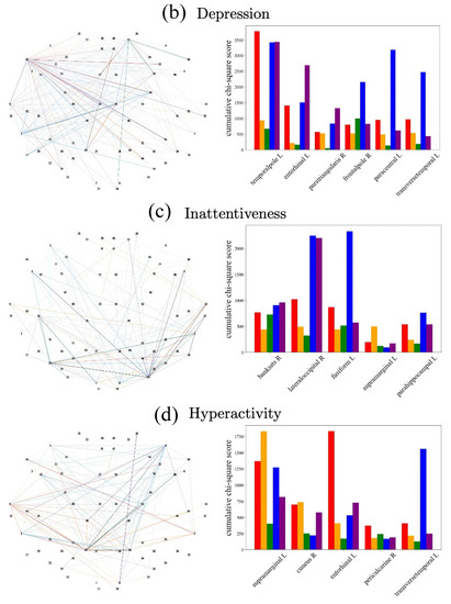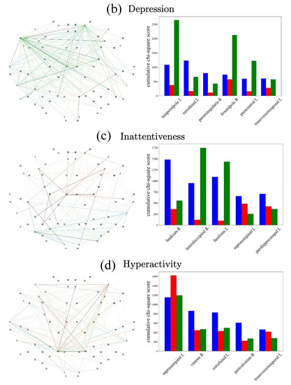 We represent the cumulative strengths of chi-square statistics (Equation (7)) corresponding to the 68 ROIs in the form of node sizes of a topographical plot, where the locations of the ROI nodes in the topographical plot are illustrative of their actual 2D brain locations as presented in the Desikan–Killiany atlas. We then examine which ROIs, frequency bands, and tasks contribute most significantly to symptom prediction with the highest chi-squared values.