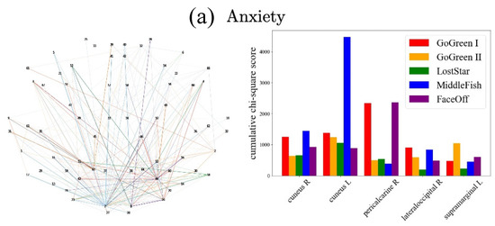 Next, we investigated the neural features that contribute to the prediction of mental health symptoms. More precisely, we identified “hub-like” spectral features in a graph consisting of 68 vertices, corresponding to the 68 ROIs, by mapping the chi-square statistic of pairs of ROIs to the graph. As shown in Table 1, for anxiety, we found that the representative 40,000 selected features contain largely the products or logarithms of the products of a specific pair of features (as generated through data augmentation), whereas the chi-squared statistics, i.e., the rank of single features, tended to be much lower. In addition, many of these high-rank pairs consisted of different ROIs, such as (19, 41) or (7, 43) (Table 1). Therefore, we present these connections among ROIs as a graph for better visual interpretation. Note that we used the chi-square statistic of not only the best 40,000 features used for classification, but also of all 2,494,820 features to precisely compute connection strengths (as below).